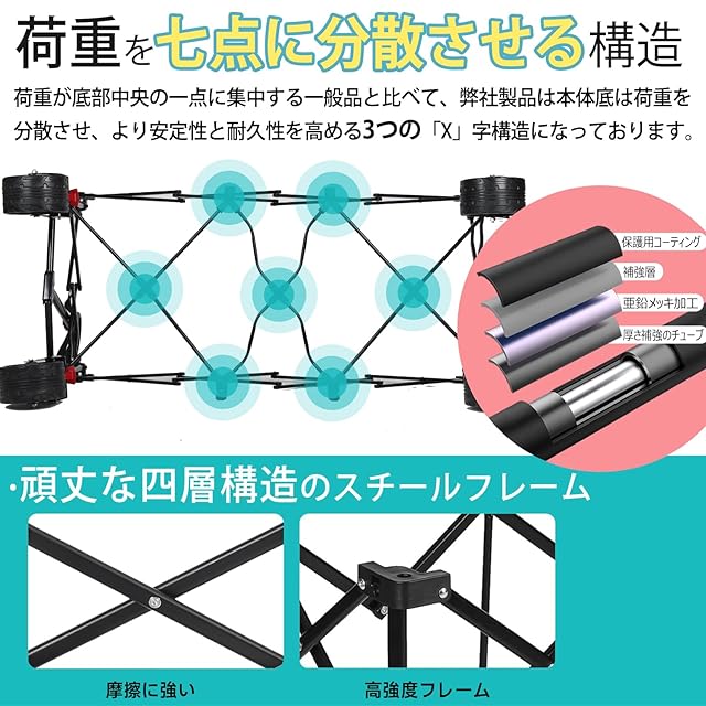 【こだわりの品質】このアウトドア カートは頑丈な四層構造のスチールフレーム(厚さ補強のチューブ、亜鉛メッキ加工、補強層、保護用コーティング)と、撥水加工の耐久性に優れた600Dのオックスフォード生地を採用しており、一層耐久性が高まります