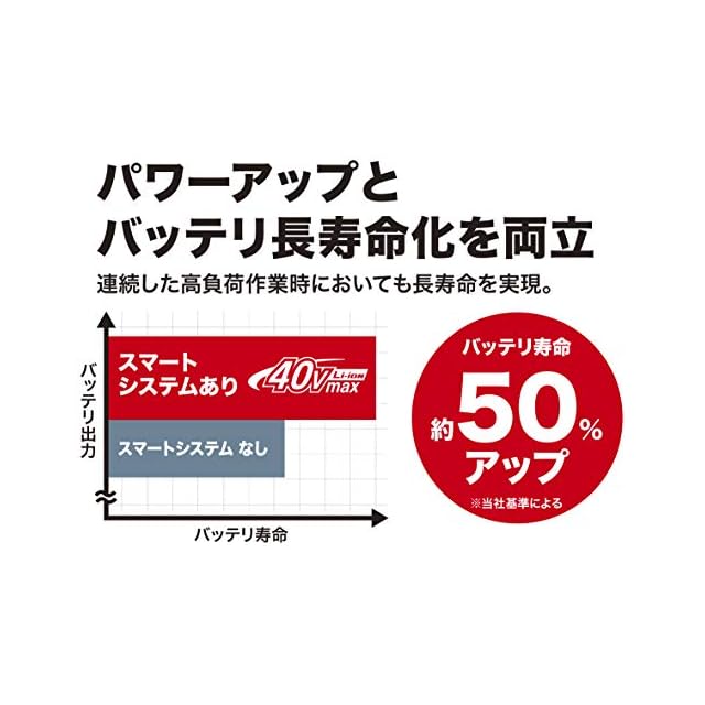 工具⇔バッテリ⇔充電器間で最適化デジタル通信。給電・充電共に最適化を実現し、高負荷時の連続作業時間アップ(最大約2.2倍※)・バッテリ長寿命化(約50%アップ※)を両立 ※マキタ基準による