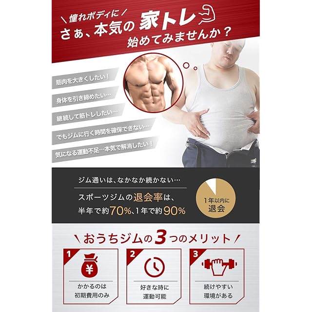 ✅【製品仕様】設置面積は約70cm×約90cmで、スペースを取らずに自宅でしっかりトレーニングが可能。総重量16.5kgで、八の字型の台座と吸盤型のフットカバーが接地面での安定感を向上させ、トレーニング中のぐらつきをしっかり抑えます。カラーはオールブラックとブラックレッドの2色をご用意しており、インテリアに合わせてお選びいただけます。さらに、取扱説明書と工具が付属しているため、女性でも簡単に組み立てられ、手軽にセットアップ可能です。