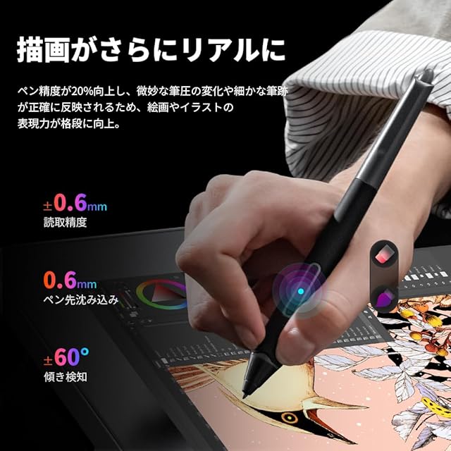 【2023新登場モデル】進化したスマートチップ「X3 Pro」の採用により、最大16384レベルの筆圧感知(業界初)を実現。わずか3gのON荷重、従来の約2倍の検知能力、イラストもスケッチも動画編集も、これまでにない精度。 【16型2.5K液晶】:フルHDよりも縦長な16:10の縦横比と、約2倍もの情報量を表示できる2560×1600(WQXGA)解像度が見やすく、効率的な作業空間を提供。アンチグレアと指紋防止のAGエッチングガラス加工を施し、本物の紙に鉛筆で描く感触でサラサラとした描画体験を実現。さらに、TÜV SÜD認証を取得、ブルーライト放射を低減しながら色精度を保ち、目にやさしい。 【Artist Pro 16 (Gen 2)特徴】①液タブの背面に折りたたみ式のスタンドを搭載、楽な姿勢で絵を描ける!②人気左手デバイスACK05同梱、動画編集や事務作業に便利!③ペンを収納できるペンケースにフェルト芯4本と標準芯4本付属、長続きに交換してご利用いただけます。④3in1接続ケーブルを無料プレゼント、別途購入する必要はありません。⑤Artist Pro 16(Gen 2)液タブ本体は通常1年間のメーカー保証を2年間に無料で延長し、長期の安心をサポートいたします。 【幅広いOS対応&簡単接続】対応システム:Windows 7以降、macOS 10.10以降、Android(USB3.1 DP1.2)、Chrome OS 88以降、Linux。※対応Androidデバイスの一覧はXPPen公式ホームページにてご確認ください。Artist Pro 16(Gen 2)は2系統の接続方法に対応し、付属のUSB-Cケーブル一本でUSB-C接続対応のパソコンと簡単に接続できます。USB-Cのないパソコンにも、3in1ケーブルを利用して接続可能です。 【様々なシーンで活躍】フォトショップ、イラストレーター、アイビスペイント、CLIP STUDIO、Zoom、PowerPointなどのソフトに対応。イラスト、お絵描き、マンガ制作、オンライン授業、テレワーク、電子署名、3Dアートなどに幅広くご活用いただけます。購入特典:本商品をご購入いただきますと、「openCanvas7」「Artrage 6」のいずれかおひとつをプレゼント。※取得方法等の詳細はXPPen公式ホームページをご確認ください。保証:お買い上げから2年間。ご質問やお困りの点等ございましたら、いつでもお気軽にXPPenサポートセンターまでお問い合わせ下さい。