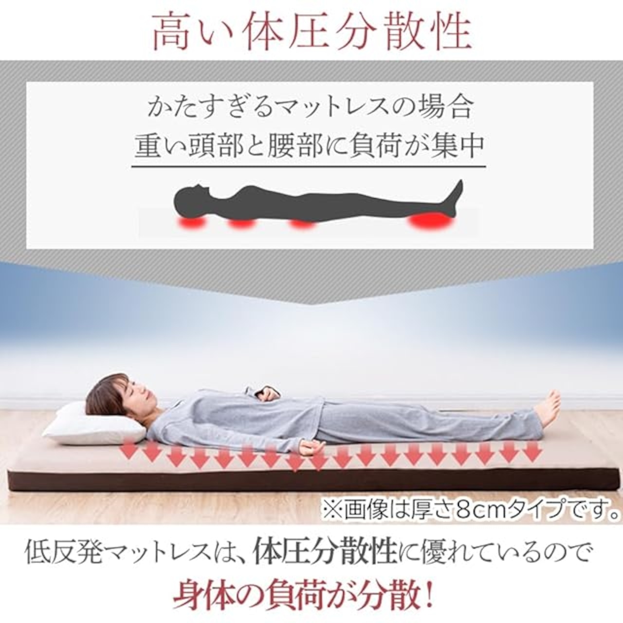 【じんわり包み込むやさしい寝心地、低反発】くせになる身体にフィットする気持ち良さ。高い体圧分散性と包み込まれるような寝心地。寝返りなどの揺れをやさしく吸収。やわらかめの65N。