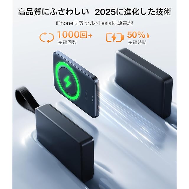 【Qi2搭載、驚異の15Wワイヤレス充電】A-ppleが策定した次世代ワイヤレス充電規格「Qi2」により、従来比2倍の15W高速充電を実現。わずか45分でiPhoneを40%充電可能な圧倒的スピードに、10000mAhの大容量が加わり、iPhone 16に約2回以上充電可能。外出先でも「充電切れ」の概念を消し去ります。パススルー充電対応で、モバイルバッテリーとスマホの同時急速充電も可能。
