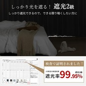 【2級遮光率】厚手3層構造・高密度で高い遮光率を実現。日差しの強い窓でもしっかりと遮光できるので、光が透けにくく、日中に降り注ぐ強い日差しもシャットアウト!専門の検査機関にて遮光率99.95%を取得したものだけを当店では「2級遮光カーテン」とし、豊富な色柄を取り揃えています。※同じ遮光率でも太陽光の強さやカーテン色により遮光効果が異なります。淡色は光が透けやすい性質があるため、より高い遮光性を求める方は濃色をお選び下さい。
