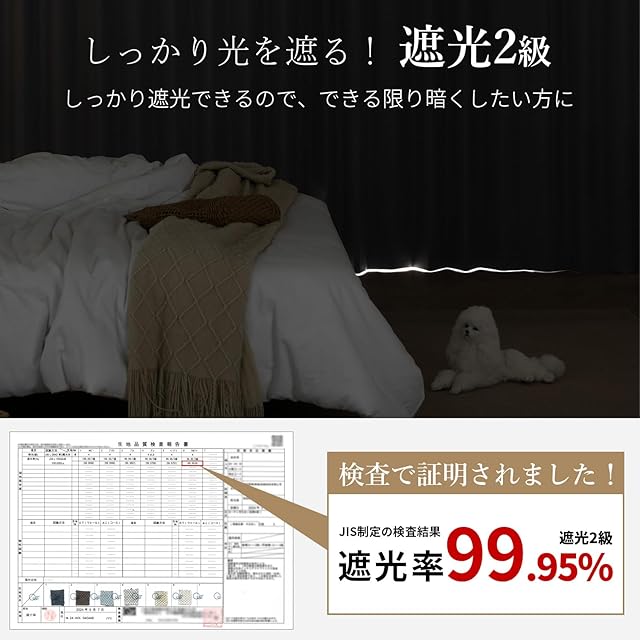 ①光沢を抑えたマットな質感が美しい。②黒ずみの少ないなめらかな生地。③快適に過ごせる優れた性能。遮光率99.33%以上、日差しの強い窓でもしっかりと遮光できるので、光をできる限りシャットアウトしたい方におすすめです。このカーテンを使えば、紫外線をカットすることによってお肌も守るし、家具の日焼けや色褪せ防止にも働きます。また、犬の目は人間よりも紫外線に弱いと言われております。紫外線は犬の皮膚にもダメージを与えるので、浴び過ぎなら犬にとっても大敵です。そのため、UVカット効果で大切なペットを紫外線から守れます。