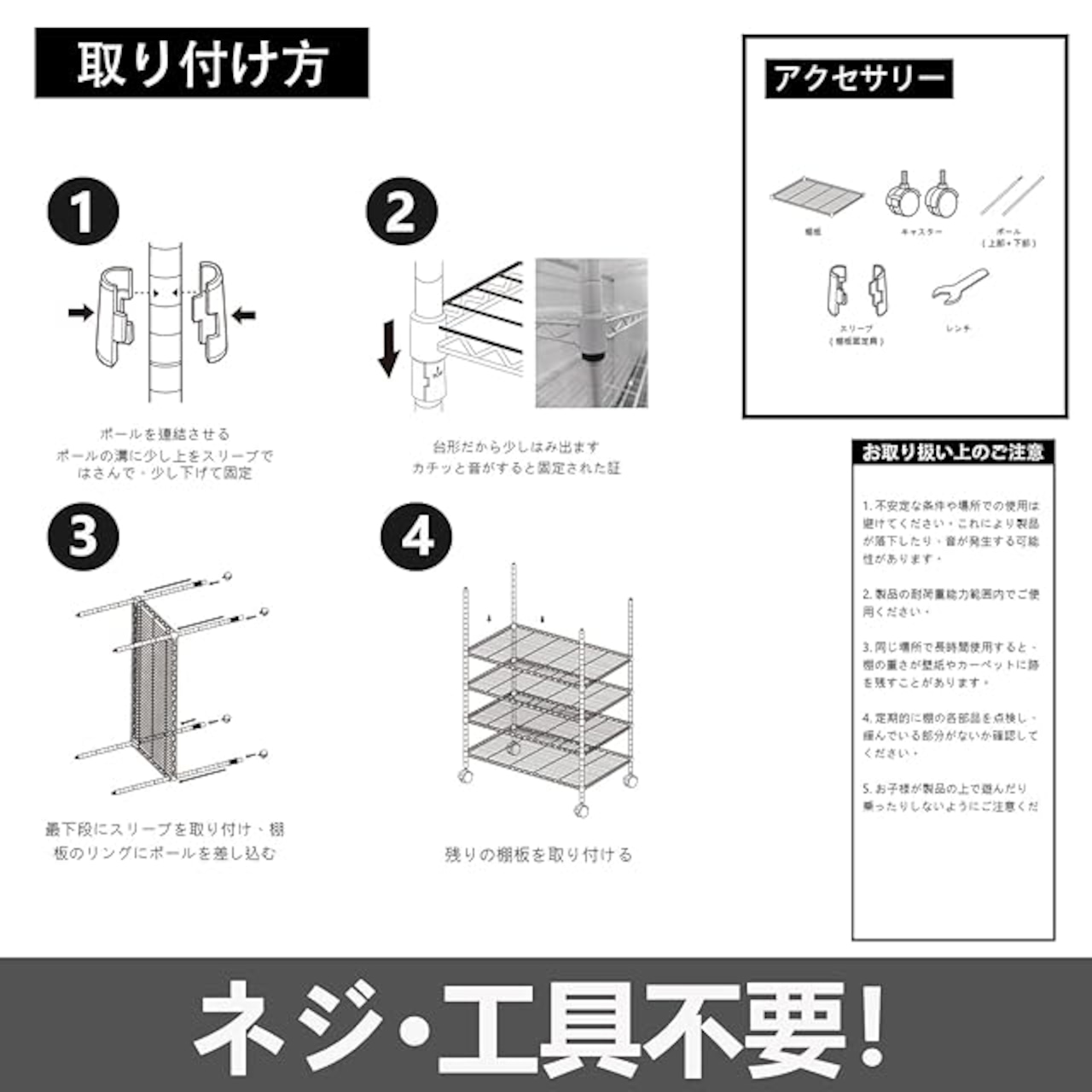 組み立て簡単:ネジや工具使わない、4ステップの簡単組み立て
