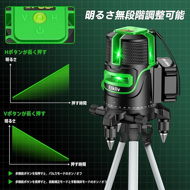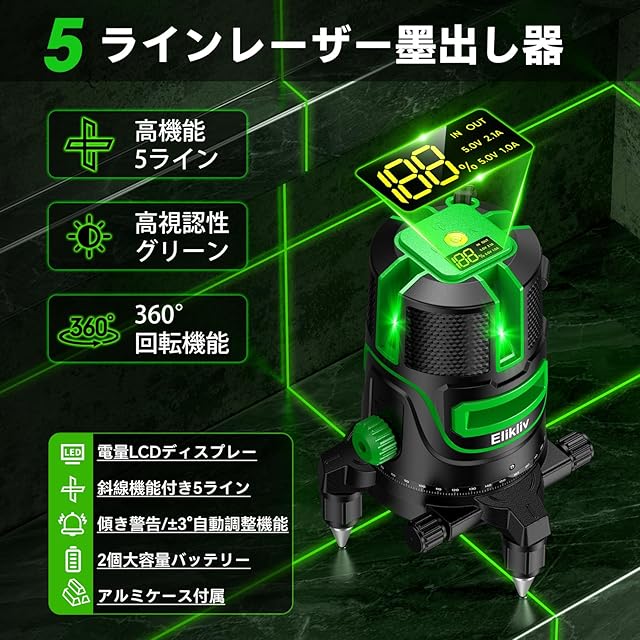 ✅ 【2025最新改良した高精度の5ラインレーザー墨出し器R5 Pro】改良点❶:他の墨出し器より本体に電量LCDディスプレーが搭載し、作業中バッテリーの残量が一目瞭然。改良点➋:エレベーター三脚付属し、レーザー水平器と一緒にケースを収納でき、持ち運びに大変に便利です。改良点❸:垂直ライン4本、水平ライン1本、5ドット。赤色よりも視覚的に見やすいとされるグリーン レーザーを採用していて、明るくクリアなグリーンレーザービームを照射し、簡単に正確な結果を得ることができます。レーザー基準:クラス2、1MW以下で、家庭やオフィスで使用できるように設計されています。改良点❹:レーザーの明るさが無段階調整できます。