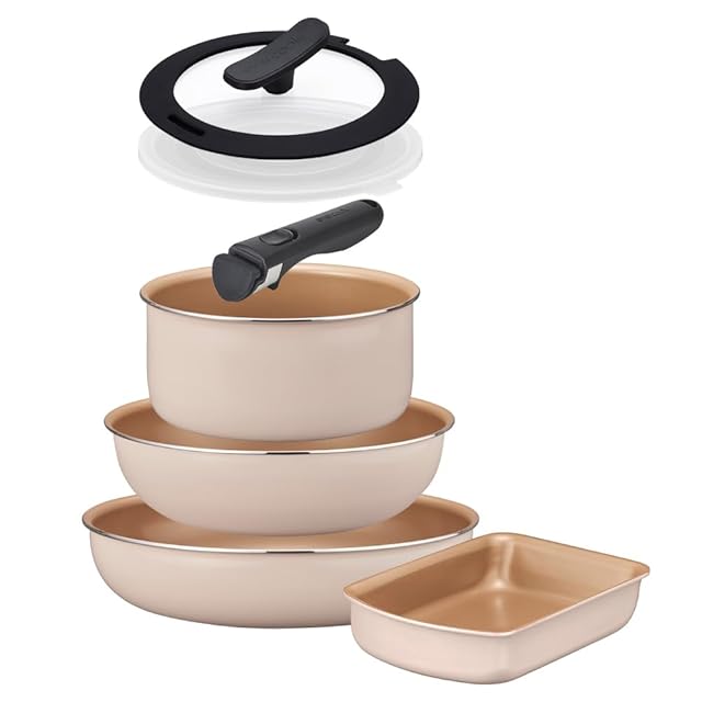 ずっと使いたくなるevercook。セット内容:玉子焼き13×19㎝ フライパン26㎝ 深型フライパン24㎝ ポット18㎝ 専用ミニハンドル ポット用プラスチックふた シリコーンリングつき18㎝ふた