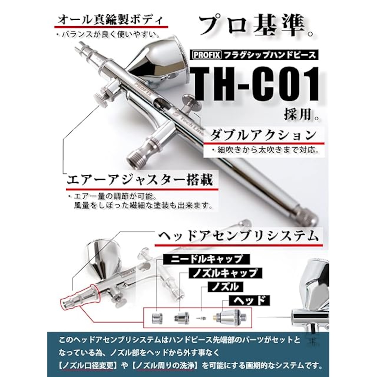■すべてが”PRO”基準 定格圧力0.066-0.1MPaという非常に高いパフォーマンスを誇るコンプレッサーに、プロも愛用するPROFIXのフラグシップのハンドピース【TH-C01】を採用。細かく繊細な塗装をストレスなく、安心して楽しむ事が可能です。 (※定格圧力は使用するハンドピースの口径、構造等により変わります。)