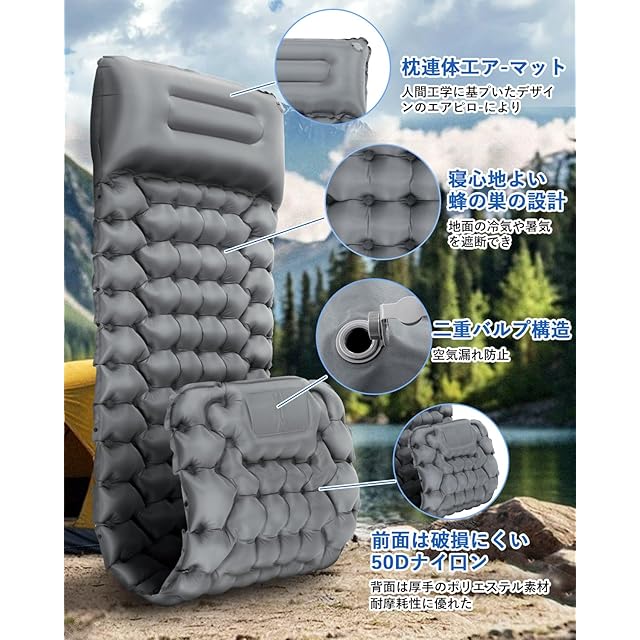 キャンプ エアーマット 2枚セット Ferbery 【10cm厚さ・寝心地良い】 足踏み式 枕付き 収納袋付き 車中泊 無限連結可能 コンパクト 折り畳み式 エアマット 災害用 キャンプ用品 アウトドア テント 厚手 軽量 防水防潮 持ち運び便利 簡単収納 (グレー) | primer