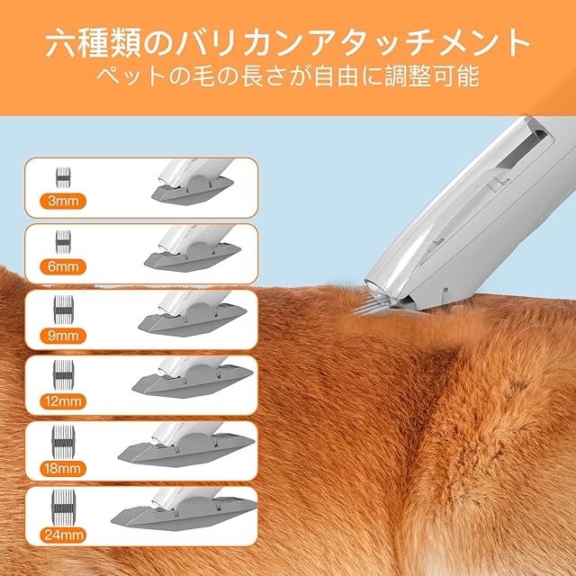 6種類の取り外し可能なバリカンアタッチメント:本製品には、ペットの毛をトリミングするための6つの異なるサイズのアタッチメント(3 mm、6 mm、9 mm、12 mm、18 mm、24 mm)を付属しております。ご希望に合わせて、毛の長さの調整が可能です