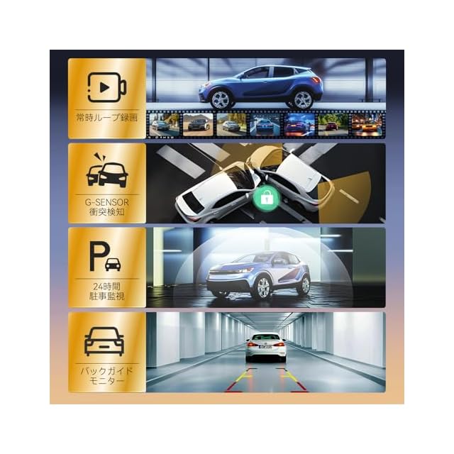 【ループ録画・起動後の表示カメラを選択可・24時間駐車監視】新しい衝突感知技術を採用Gセンサーし、衝撃受けた時(3つ感度検知の選択で実際より適当に調節可能。)、緊急録画を入り、録画ファイルが自動ロックされるので上書きされません。専用降圧ケーブルを利用し、24時駐車監視可能。ループ録画機能があり、録画ファイルの長さ(1分間、3分間、5分間)に設定、メモリーカードが足りない時は最初のファイルから上書きし、1秒も漏らさずに録画します。