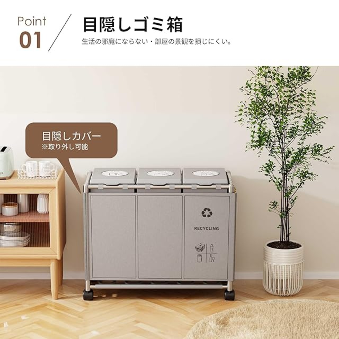 【3分別*30L 90L大容量】本体サイズ:長70*幅29*高59cm。3分別で缶・びん・ペットボトル、プラスチック製容器包装、古紙など各種ゴミを効率的に分類できます。高い空間効率を実現し、見た目がすっきりとしたデザインでデッドスペースを最小限に抑えます