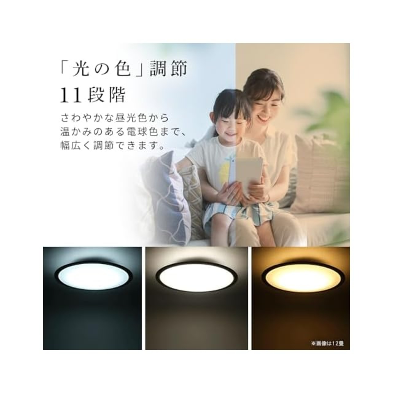 調光(明るさ)調節10段階シーンやお好みによって、明るさを調整できます。調色(光の色)調節11段階さわやかな昼光色から温かみのある電球色まで、幅広く調節できます。