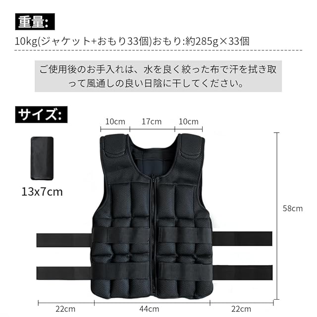 【重さ調整可能&取り外し可】 10キロウエイトジャケット:ジャケット+重り33個。各重りの重さは285g 。ジャケットにある計33個のポケットに出し入れすることで、簡単にウエイトの調整ができます。トレーニングの種類によって重量を調整して鍛えることが可能。重量ベストを着用して階段を上り下りするだけでも、かなりの筋力トレーニング効果が得られます。砂袋が二層包装されており、中身が漏れにくいデザインとなっています。