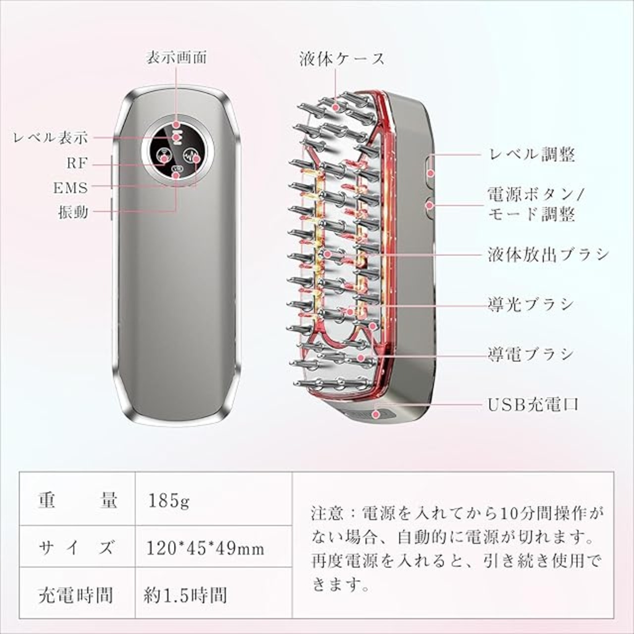 【4つの機能と3つのレベルを搭載】本製品電気バリブラシは振動、EMS微電流、RF、LED赤色光の4つの機能を備えています。電源を入れるとLED赤色光機能がデフォルトで起動し、次の3つのモードを組み合わせて使用できます:①LED赤色光+RF、②LED赤色光+EMS、③LED赤色光+振動。各機能の強度は初期設定で1段階目となり、全体で3段階から選べます。*EMSの高いレベルでは軽い電流を感じる場合がありますので、1段階目から開始し、慣れてきたら他のレベルもお試しください。