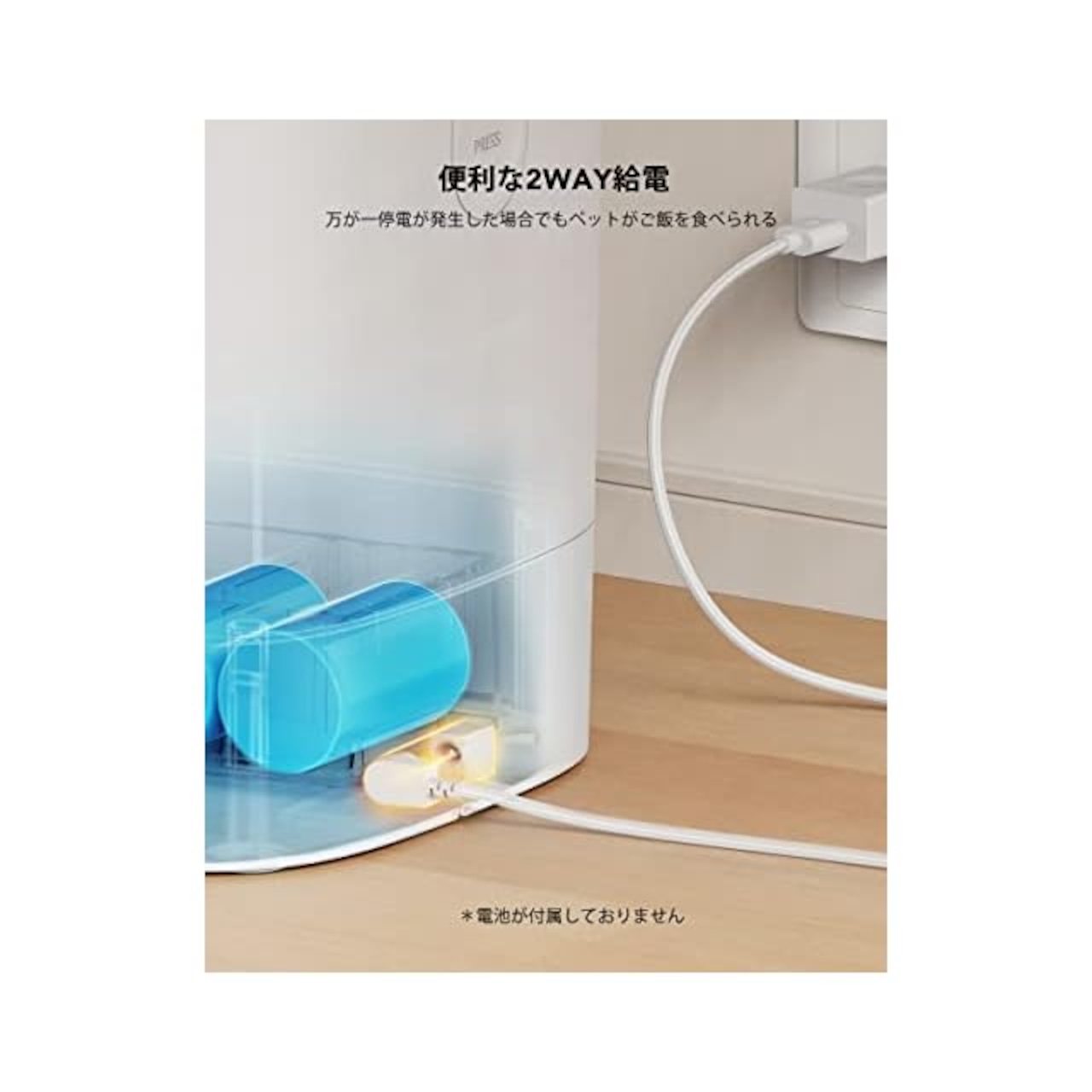 【2WAY給電 停電対策】:自動給餌器は5V ACアダプターと3本の単1形アルカリ乾電池(別売り)の2WAY給電があります。設定メモリを搭載しているので、電源を切っても給餌の設定を保存できます。万が一、停電する場合は電池で稼働し、災害時にも安心してご利用いただけます。(一般には電源を必ず使用して、バッテリーは停電時の予備オプションとしてのみ使用してください。)