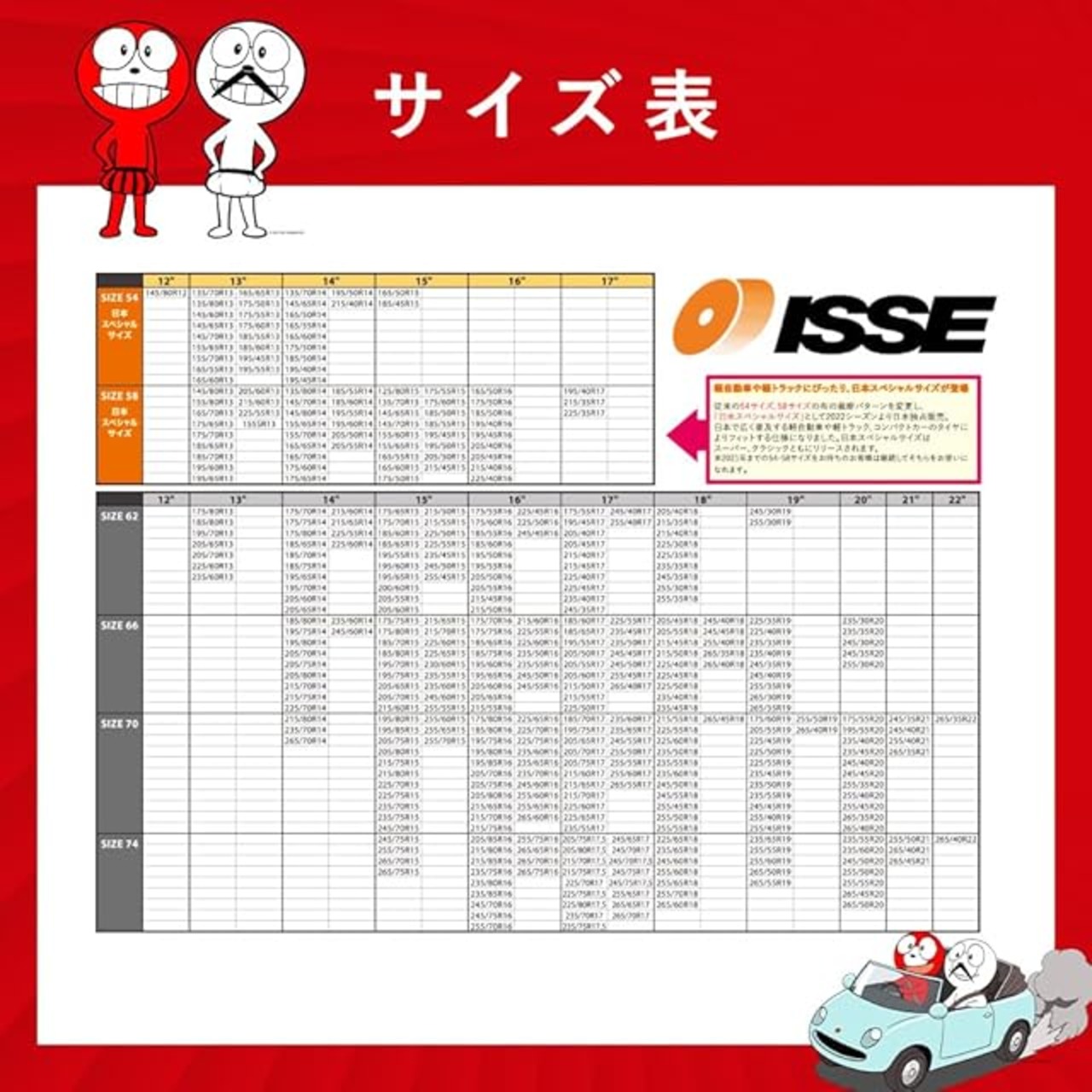 軽量で取り付けも簡単な布製タイヤチェーンはいざという時の緊急脱出ツールとして注目されています。<br><br> イッセ・スノーソックスは、軽量でコンパクト、取り付けやすいという布製ならではの特性はもとより、金属チェーンに匹敵する圧倒的なグリップ力をほこるヨーロッパ生まれの布製タイヤチェーンです。<br><br> 圧雪、深雪、アイスバーンの他、水分の多い日本の雪路、シャーベット状の路面、どんなコンディションでも安心して走行できます。<br><br> 生地は業界最強級の耐久性を誇り、繰り返し装着しても破れません。また独自のオートセンター機能がイッセ・スノーソックスを走行中も適正な位置に維持し、ずれません。<br><br> 6サイズで市販のほぼすべてのタイヤサイズをカバー。SUVや大型乗用車、クリアランスの狭いスポーツカータイプにも装着できます。年に数回の利用であれば洗って保管することで数年は使用可能なため、冬用タイヤに履き替えるための時間的・経済的なコストもありません。<br>