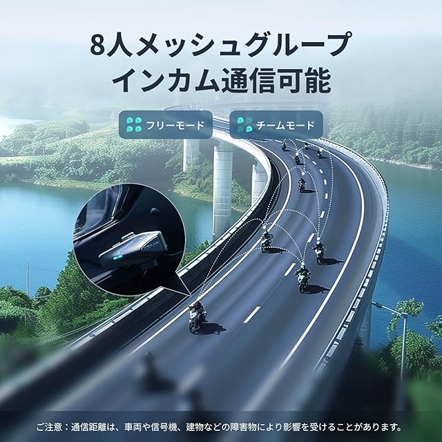 【デュアルメッシュ通信モード】フリーモードでは最大8名のライダーが通信範囲内で自動的に接続します。チームモードでは、MESH通信技術を利用してプライベートな通話を楽しめます。チームモードは最大8ライダーのグループ通話をサポートし、チームリーダーチャット(2~3人)や1対1のプライベートチャットが可能なバイク インカムです。