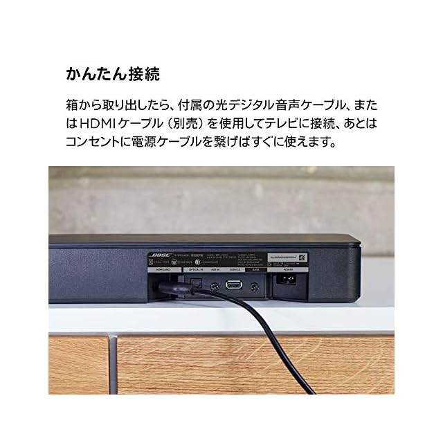 簡単セットアップ — テレビとサウンドバーは、光デジタルケーブル(付属)またはHDMIケーブル(別売り)を1本接続するだけ。わずか数分でセットアップできます。