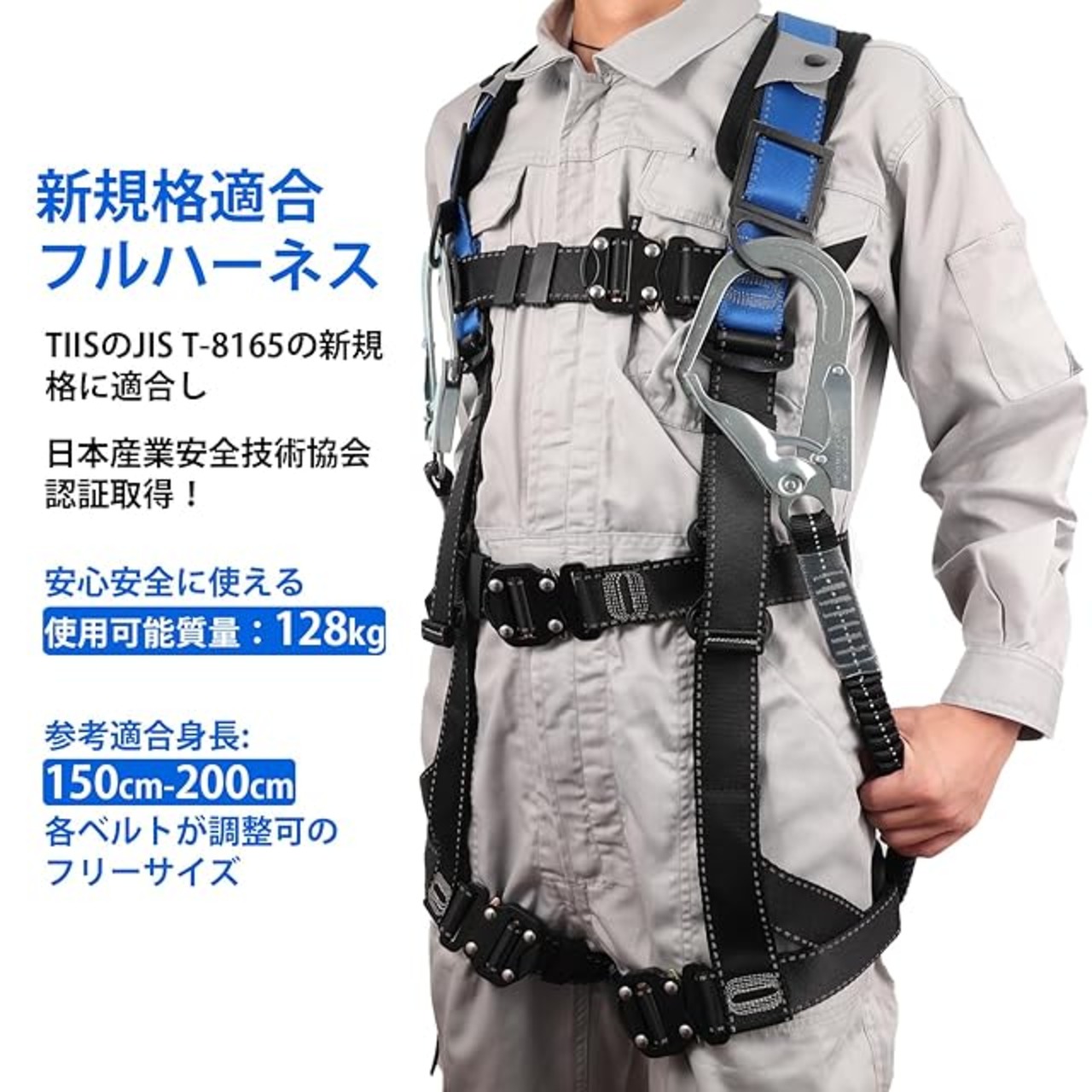 【フルハーネス仕様】:ベルト:高強度ポリエステル。バックル:合金鋼 、D環止め:合金鋼。フルハーネス重量約2.2kg、参考適合身長:150cm-200cm、腰回り:81-109cm 腿回り:40.6-84cm、使用可能質量:128kg以下。ランヤード重量:約1.2Kg。ショックアブゾーバ種別: 第一種(4kN)、最大自由落下距離: 2.5m、ランヤード長さ:伸縮式 130~200cm、使用可能質量:100kg以下。