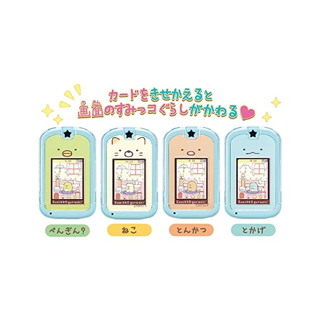 たくさん遊んでお勉強もできる55アプリを搭載したすみっコぐらしのきせかえスマホトイ。きせかえカードで画面のすみっコがチェンジ!