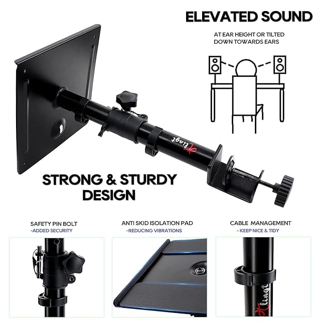【高められたサウンドと傾斜したトレイ】スピーカーを耳の高さまで上げます。上部が誤って滑り落ちるのを防ぐための安全ピンボルトが付いており、デスクトップスピーカースタンドを4つの異なるロック高さで固定します。(22cm、28cm、32cm、または 36cm)クリアで高尚なサウンドを実現します。トレイの傾きは +10° から -10° の範囲で完璧な角度に簡単に調整できます。
