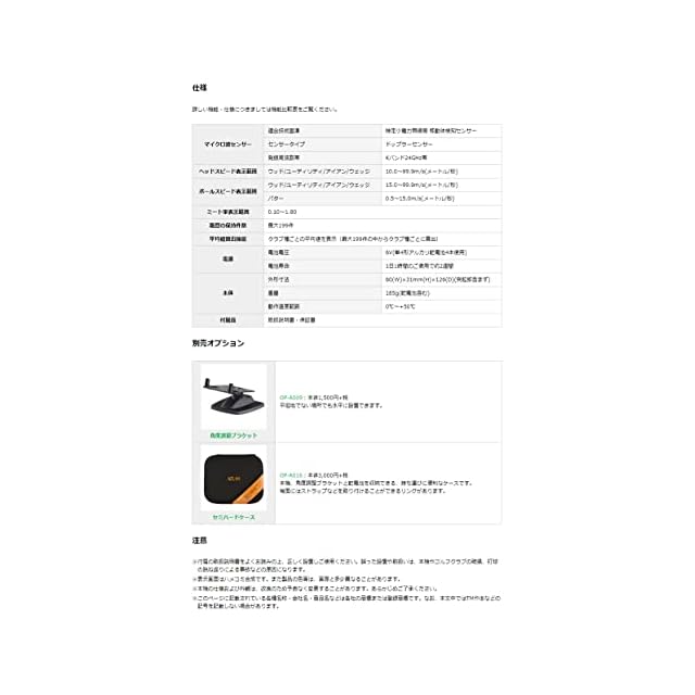 スルガオンラインでの累計販売台数は80,000台を突破!「ヘッドスピード」「ボールスピード」「推定飛距離」「ミート率」4つを1画面で同時表示。GST-3Gからの変更点は、表示範囲の拡大でアプローチの練習に対応。ヘッドスピード下限…15.0m/s→10.0m/s、ボールスピード下限…20.0m/s→15.0m/sに変更されました。スイング回数のカウントも可能になりました。これらパワーアップした点は上位機種にも搭載されている機能です。左利きにも対応!単4形アルカリ乾電池4本使用。コンペ景品、プレゼントにも最適!同系統のGST-5Wよりも安くおすすめです(バッテリーが充電式か電池式か、SDカードスロットがあるかないかの違いのみ)。