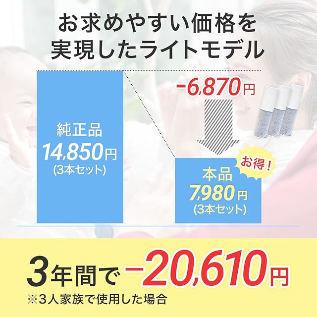 浄水能力: 遊離残留塩素、CAT、2-MIBカビ臭、溶解性鉛 ろ材の種類: 中空糸膜、イオン交換繊維、活性炭、不織布。 カートリッジの取替時期の目安: 1日に10Lご使用の場合、約4ヶ月/個。×3個で合計1年分です。(取替時期の目安は、ご使用の水量・水質・水圧などにより異なります。)