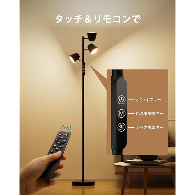 【リモコン&タッチ2種類のコントロール方式】私たちのフロアライトは、リモコンとタッチコントロール機能を備えています。リモコンは障害物があっても完璧に機能し(範囲は10メートル)、簡単に明るさや色温度を調整し、部屋のライトをオン・オフできます。