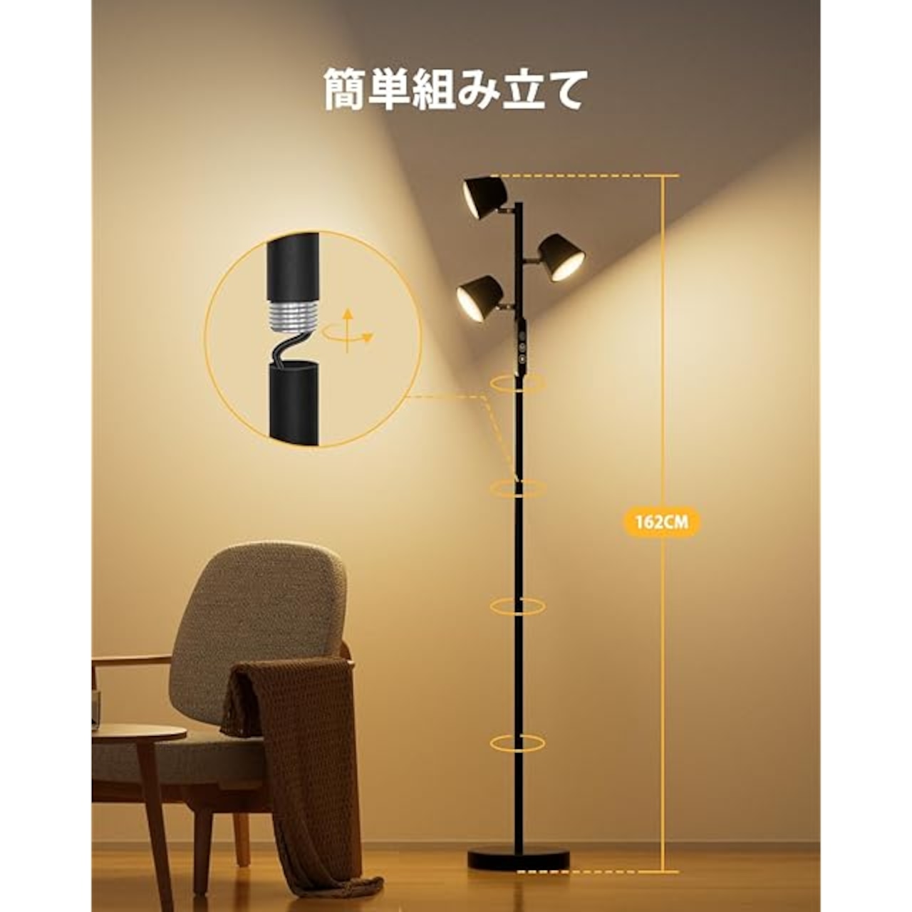 Jplednas フロアライト LED「3灯・3色温度・5段階調光・30分&60分のタイマー」間接照明スタンド「30W・高さ162cm」タッチ・リモコン付き 高演色 目に優し 多角度調節 全金属 簡単組み立て(ブラック)