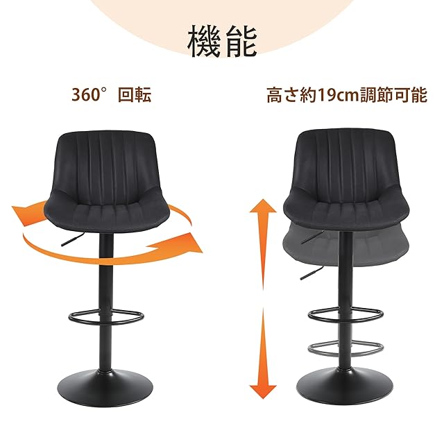 調節可能なバーチェア:完全に回転し、高さを調節できる2脚のモダンなバーチェア。バースツールの高さは、座面下のハンドルで簡単に上下に20cm調節できます。スムーズな360°回転で、さらにフレキシブルに。