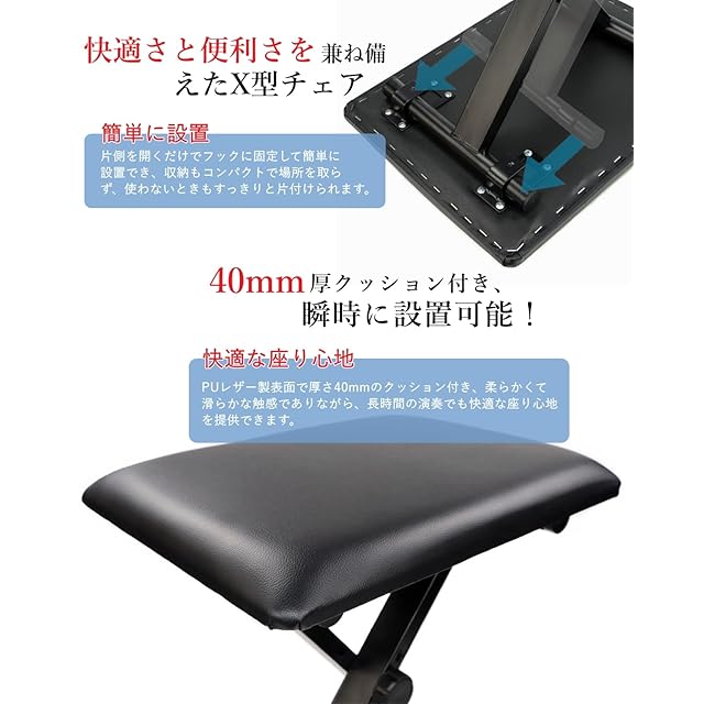 【キーボートベンチ】★3段階高さを調整可能。身長や用途に応じて40~48cmの間で3段階調整できます。★PUレザー生地の表面で、40mm厚さのクッション付き、柔らかくて滑らかな触感でありながら、長時間の演奏でも快適な座り心地を提供できます。★片側を開くだけでフックに固定して簡単に設置でき、収納もコンパクトで場所を取らず、使わないときもすっきりと片付けられます。