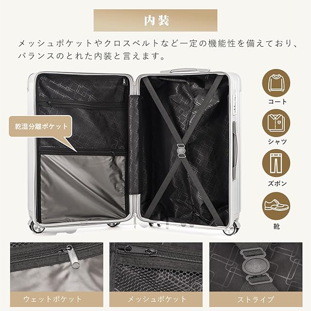 【製品仕様】人気のある色があり、ビジネスでもカジュアルでもご使用いただけます。○Sサイズ (幅×奥行×高さ) 22.5cm x 36.5cm x 54.5cm 本体重量 :約2.8kg(付属品含まず) 容量:約41L(1~3泊対応)○Mサイズ (幅×奥行×高さ) 24.5cm x 44.5cm x 65cm 本体重量 :約3.6kg(付属品含まず) 容量:約63L(4~7泊対応)※ 多少の誤差はご了承ください○1年保証・日本語説明書