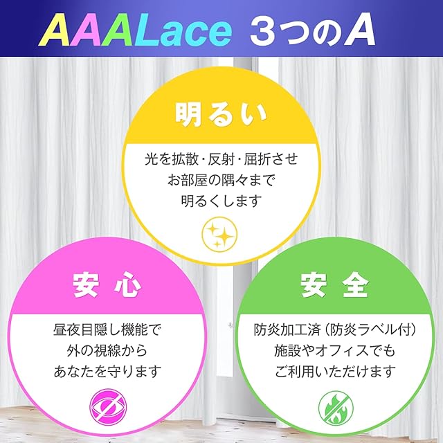 <b>安心・安全・明るいレースカーテン AAA lace(トリプルエーレース)</b><br><BR>新素材<b>ウェーブロン +</b>を使用!<BR>光を採り入れられるのに高いUVカット率・遮熱効果があります<BR><BR> ◎<b>AAA laceのどこがトリプルA?</b> <BR>【AAA-1】<b>「UVカット」</b>家具やお肌を紫外線から防ぐ<BR><BR> 【AAA-2】<b>「採光」</b>光をよく通し室内の隅々まで明るく<BR><BR> 【AAA-3】<b>「遮像」</b>昼 夜透けにくく視線をカット<BR> <BR> <BR> ★防炎加工タイプ<BR> 店舗や事務所など、消防法で定め らている不特定多数が訪問する場所では<BR> 消防法認定(財)日本防炎協会の防炎ラベルのついたカーテン が必要となります。<BR> <BR><BR> ●<b>AAA laceはどうしてこんなに凄いのか?</b></b><BR>・安全性の 高い難燃糸<b>「スーパーエクスター」</b>使用。<BR> 表面的な加工ではないため、耐久性に優れた防炎性 能が実現できます。<BR> もちろんすべて防炎ラベル付きです。<BR><BR>・ 帝人開発の四つ山扁平状構造の糸<b>ウェーブロン+</b>が自然光を採り入れながら、外からの視線を遮りま す<BR> 光を拡散・反射・屈折させる繊維構造に紫外線吸収剤で加工し<b>紫外線カット率85.7%</B><BR> <BR> ・ 通常のレースやボイルと比較して<br> 部屋の冷暖房効率を高め大きな省エネ効果を発揮。<br><b> 断熱効果 24.0%・保温効果20.7%</b> しかも通気性や採光性は損なわないので快適です。<BR> <BR>