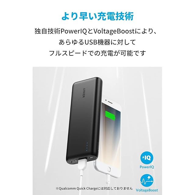 Anker PowerCore 20100<br>PowerIQ搭載の超大容量モバイルバッテリー<br><br>主な製品仕様<br>寸法:約166 x 58 x 22mm<br>重量:約356g<br>入力:5V/2A、出力:5V / 4.8A<br><br>超大容量 <br>20100mAhの大容量で、iPhone 11 Proに約4回以上、Galaxy S9に約5回、iPad Pro (2018, 11インチ)に約2回の充電が可能です。<br><br> フルスピード充電技術 <br> Anker独自技術PowerIQ(接続機器を検知し電流を最適化)とVoltageBoost(ケーブル抵抗を検知し出力電圧を自動調整)により、フルスピード充電を実現しました。 <br><br> 業界トップクラスの4.8A出力 <br> 業界トップクラスの4.8A出力で、タブレット2台も同時にフルスピード充電が可能です。 <br><br> よりコンパクトに <br> 従来の20000mAhモバイルバッテリーから、サイズ重量ともに約30%の小型化・軽量化を実現。20000mAh以上のモバイルバッテリーでは、最もコンパクトです。 <br><br> マット仕上げ <br> 汚れや指紋もつきにくい高級感のあるマット仕上げ。グリップ力もあり、持ちやすい作りです。 <br><br> 世界でも名高い製品保証 <br> Ankerは弊社製品に絶対の自信を持っています。そのため、18ヶ月保証と品質の高いカスタマーサポートを全ての製品に提供しています。<br><br> 最適なご使用のために <br> ・付属のケーブル、お使いの機器の純正ケーブル、または第三者の認証を受けたケーブル(MFiなど)をご使用ください。 <br> ・Apple, Androidのスマートフォン、タブレット(Nexus 7 を含みます)、その他のデバイスに対応しています。(iPod nano、iPod Classic、HP TouchPad、Dell Venue 11 Pro、Asus製タブレット、GPS製品とBluetooth 製品の一部には対応していません。) <br>・バッテリー本体を高速かつ安全に充電するために、Anker製または純正の充電器をご使用ください。それ以外の場合、相性により適切に充電できない場合があります。<br> ・製品を正常に充電するために5V/2A以上出力できる充電器をご用意ください。