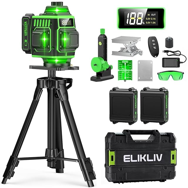 【2025最新改良】Elikliv レーザー墨出し器 グリーンレーザー 水平器 4x360° 16ライン フルライン 電量LCDディスプレー搭載 レーザーレベル 水準器ツール 回転レーザー線 緑色 小型 コンパクト 自動補正 高輝度 高精度 受光器対応 軽天作業 DIY 測量建築 リモコンコントロール 大容量バッテリー2個・360°回転金属ベース・三脚付き 型番:R16 Pro | primer