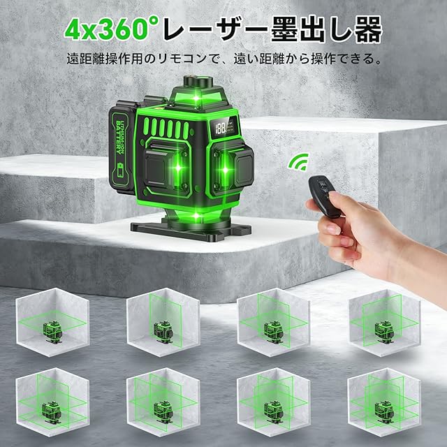 【2025 年最新改良の高精度 16 ラインレーザー墨出し器 R16 Pro】改良点❶:エレベーター三脚が付属しています。レーザー水平器と一緒にケースに収納でき、持ち運びに大変便利です。改良点❷:本体の下には金属の 360° 回転ベースがセットされています。これにより、水平方向に 360° 回転することができます。改良点❸:他の墨出し器に比べて、本体には電量 LCD ディスプレーが搭載されています。そのため、作業中のバッテリー残量が一目瞭然になります。当社の水平器レーザーは先進のレーザーテクノロジーを採用しており、非常に高い精度を実現しています。赤色よりも明るく鮮明なグリーンレーザービームを放射し、作業中の視認性を大幅に向上させます。2 本の 360° 水平線と 2 本の 360° 垂直線が組み合わされることで、部屋のあらゆる場所までカバーすることができます。レーザー基準はクラス 2 です。