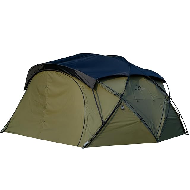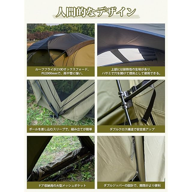 【TC素材、四季適用】人気のTC生地を採用:コットン35%、ポリエステル65%、遮光性、通気性も良いので、結露しにくいです。更に、耐久性に優れていて手触り も良く、火の粉にも強いため、気軽に焚き火が楽しめるのも嬉しいポイントです。さらに、雨や雪の日でも安心して使えるよう、210Dオックスフォード素材の大型ブラックルーフも付属する。