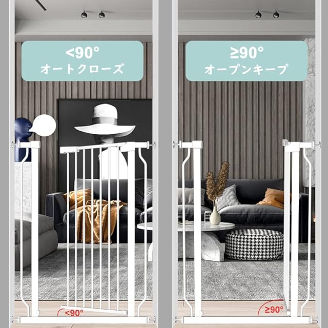 ベビーゲート高さ103㎝、お子様やペットが簡単に乗り越えないようなゲートでございます。また、二重ロックになっておりますので、上下二箇所にロック付きのダブルロックなので、安全ダブル確保です。オートクローズのタイプなので、90度未満の場合は、自動的に開閉できるオートロックタイプです。 約90度に開くと自動的に固定でベビーゲート高さ103cm、100cm以上のセーフティー安全ゲートです。赤ちゃんを抱いてもスムーズに開けるように考えた片手スリムベビーゲートです。壁に傷など残らないように、突っ張りタイプのデザインで、アジャスターボルトで簡単に固定可能です。開放キープやオートクローズの機能付き。拡張フレーム付きなので、最大設置幅216cm、拡張フレームの取り外しによって、サイズの調整も簡単にできます。1mを超える高さなので、赤ちゃんとペットにピッタリの高さです。 きる開放機能、開放状態をキープすることができます。色はブラックとホワイトを二色と幅サイズを多くご用意しておりますので、お部屋に合う色とサイズを選ぶことができます。