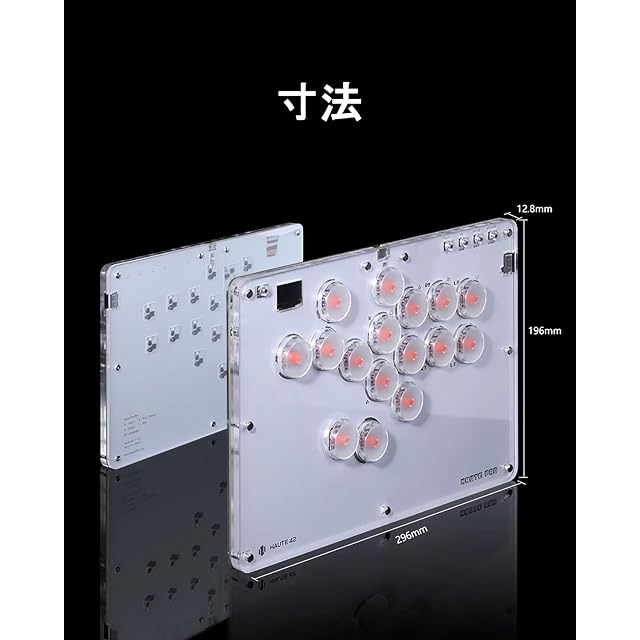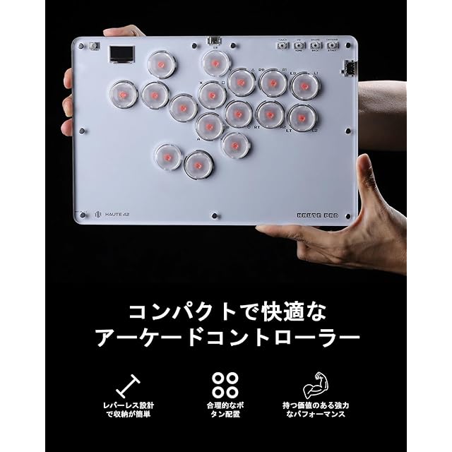 【薄型ロープロ16ボタン仕様のレバーレスアケコン】:薄型で天板広め、ロープロファイルのスイッチを搭載した16ボタンのレバーレスコントローラーです。 従来のファイトスティックを超え、格闘ゲームにはすばやく操作できるレバーレスタイプがおすすめです。進化した高精度の4つの方向ボタンと高速オプティカルスイッチを備え、ゲームプレイ時の入力エラーを排除し、より早くより正確な操作を実現しました。対応機種:Windows 10以降/ Steam Deck/PS3/PS4/Switch/Raspberry Pi(Lakka、RetroPie、Recalbox、Batocera)/MiSTer/Android、Linux、iPadOS、macOS. PS5やXBOXに接続する際は、専用の格ゲーコンバーターが必要です、互換性を確保するために、ぜひ別途にご購入ください。弊社では、PS4/PS5に対応したBooter5コンバーターと、XBOX用のBrook Wingman FGCを取り扱っています。 【ご注意&超低1ms遅延】:PS4/PS5本体の接続については、公式サイトまたはマニュアルを参照して設定する必要がありますので、必ず日本語取扱説明書または公式サイトのリンク先(haute42.com/supports/)をよくお読みください。基盤/システムは低遅延のRaspberry pi pico GP2040-CEを搭載しており、静音性に優れボタンの高さを抑えた「Kailh Choc V2」の赤軸を使用しています。【ホットスワップ&RGB LEDライトDIY】:RGB照明効果を備えた透明なアクリル素材で、お好みのイラストを入れてDIY可能、発光パターンは4種類、配色は概ね好きな色に設定でき、ボタンを押した時だけ別の色に光らせることも可能です。ホットスワップ対応、複雑なプロセスしなくて、易くてキースイッチを交換することができます。様々な打鍵感を体験できます。【SOCD&ターボ機能】:レバーレスのコントローラーとしてはお馴染みのRaspberry Pi Picoを使っているのです。そのため、SOCDやDirectInput、Xinput変更、D-pad、ターボ機能、アナログスティック変更、EXT ポートとM1/M2 カスタムボタンなど機能を搭載しております。