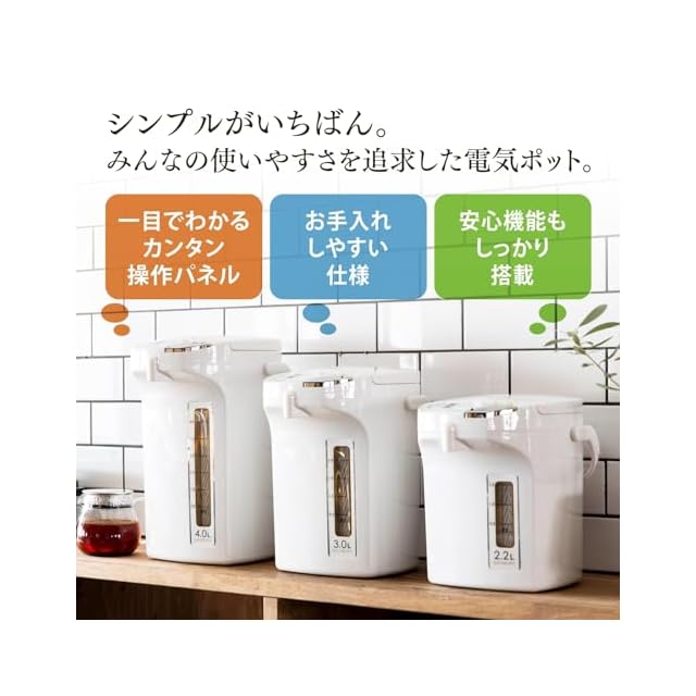 「安全に使いやすく」をコンセプトに、操作パネルの文字や給湯ボタンのサイズを大きく配置したシンプルな電気ポット。 ■沸とうカルキとばし機能付きだから安心して飲める ■給湯ボタンを大きくし角に配置することで、指でしっかり押せるポット ■注ぎ口は、最前面に突き出ているので湯の出口がはっきりわかる ■保温機能付きなので、使いたい時にすぐ使える ■「ロック・解除」がわかりやすいスイッチ式のロック機構 ■注ぎたいところに、クルっと回る360度回転底 ■スッキリ見やすい水量計の電気ポット ■空だき防止機能付き ■万が一引っ掛けても、簡単に電源コードが外れるマグネットプラグ式 ■加工などを施していない耐久性のあるステンレス内容器使用のポット ■プラスチックボディなので軽くてサビにくい ■上ふた着脱式なので、お手入れがしやすい電気ポットです
