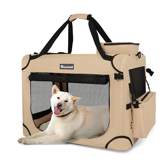 Totoro ball ソフトクレート 中型犬 犬用クレート 犬用キャリーバッグ 犬 キャリーケース 折りたたみ 犬 車用ケージ 5面メッシュ 頑丈耐久 ロック付き 給水ボトルバンド付き 中型犬・猫2匹 15kgまで『トランク、旅行、避難、室内外兼用!』 (ベージュ, L(70L x 52W x 52H cm))