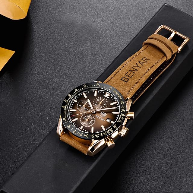 BY BENYAR 腕時計 メンズ 時計 クロノグラフ アナログ腕時計 30M防水 ビジネス シンプル おしゃれ 人気 フォーマル 革ベルトクォーツ メンズ ウォッチ 男性へのギフトブラウンゴールド | primer