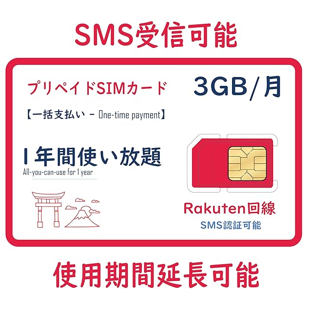 【使用期間】RAKUTENのプリペイドSIMカードは、ご購入日から1年間ご利用いただけます。国内外での利用が可能で、毎月【3GB+1GB】のデータ容量(楽天回線エリア内)が1年間提供されます。1年後も、SIMカードの延長が可能で、引き続きご利用いただけます。SMS認証に対応しており、LINEやSkypeなどのアプリケーションを簡単に登録できます。