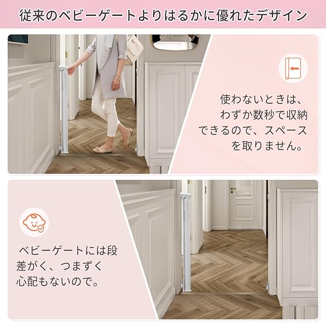 【従来のベビーゲートよりはるかに優れたデザイン】 使わないときは収納できるロールタイプ、スペースを取りません。 ベビーゲートには段差がく、移動がしやすく、つまずく心配もないので、新生児へのお祝いにもお勧めです。