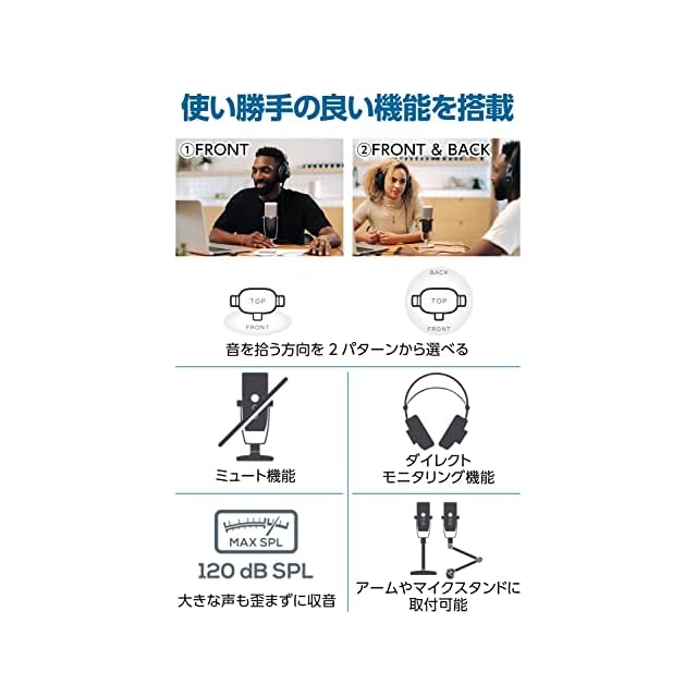 ✅【音を拾う方向を2パターンから選択可能】1人で話す場合はフロント(前方のみ)を、対談の場合はフロント&バック(前方と後方の両方)を選べるため、様々なシーンで活躍します。つまり、単一指向性マイクとしても双指向性マイクとしてもお使いいただけるUSB式の配信用マイクです。