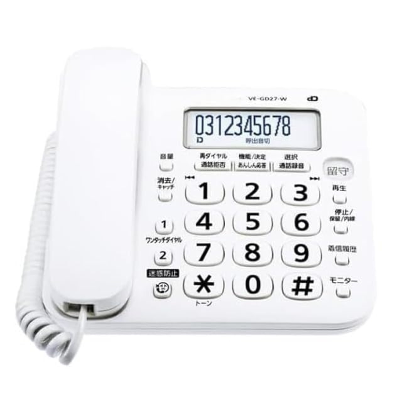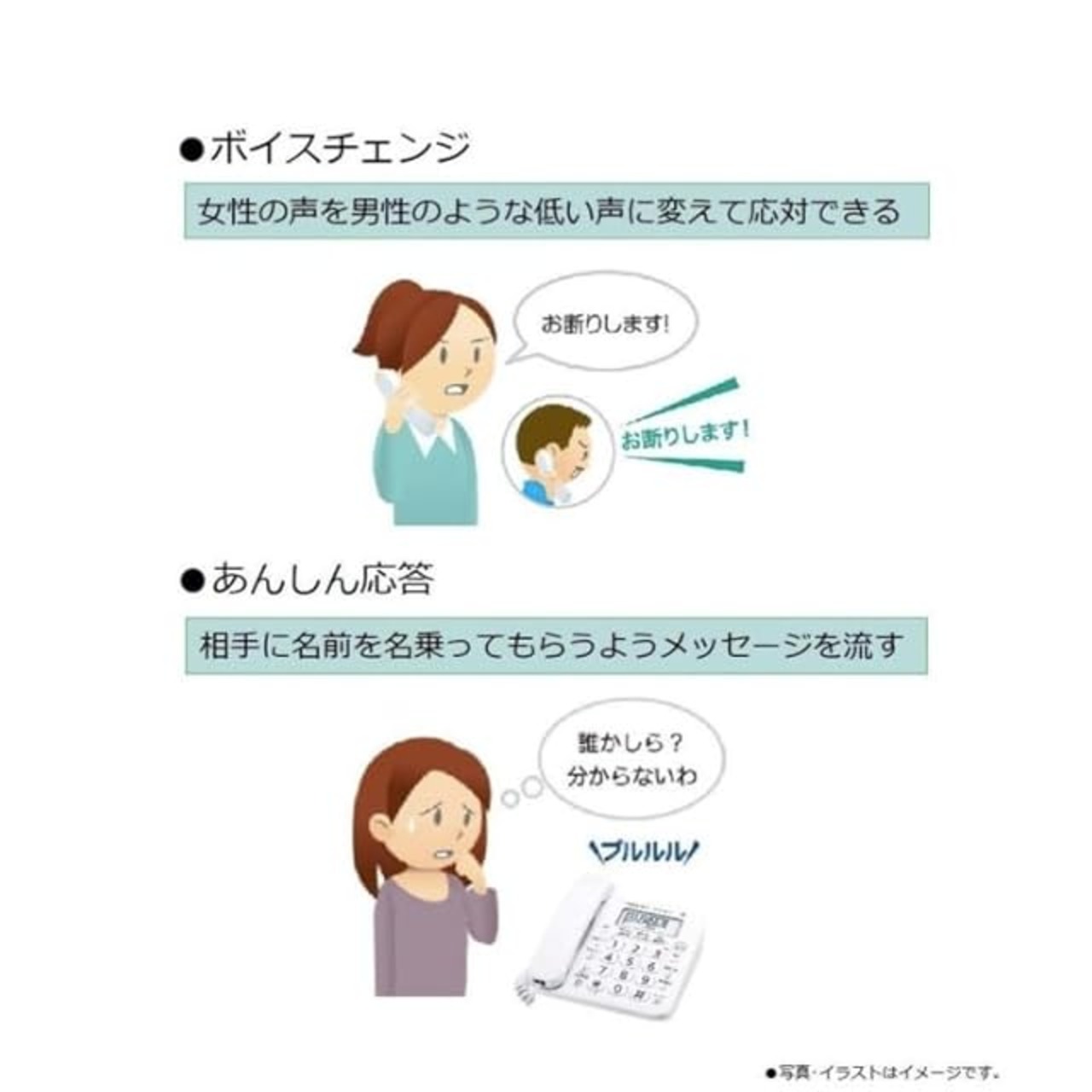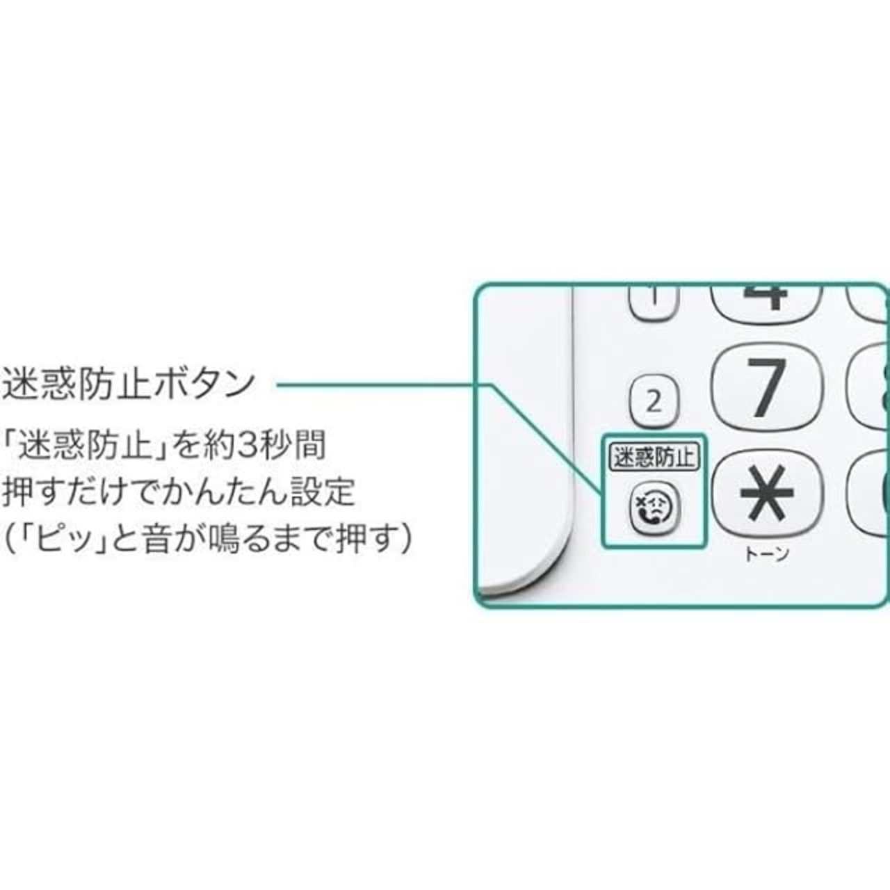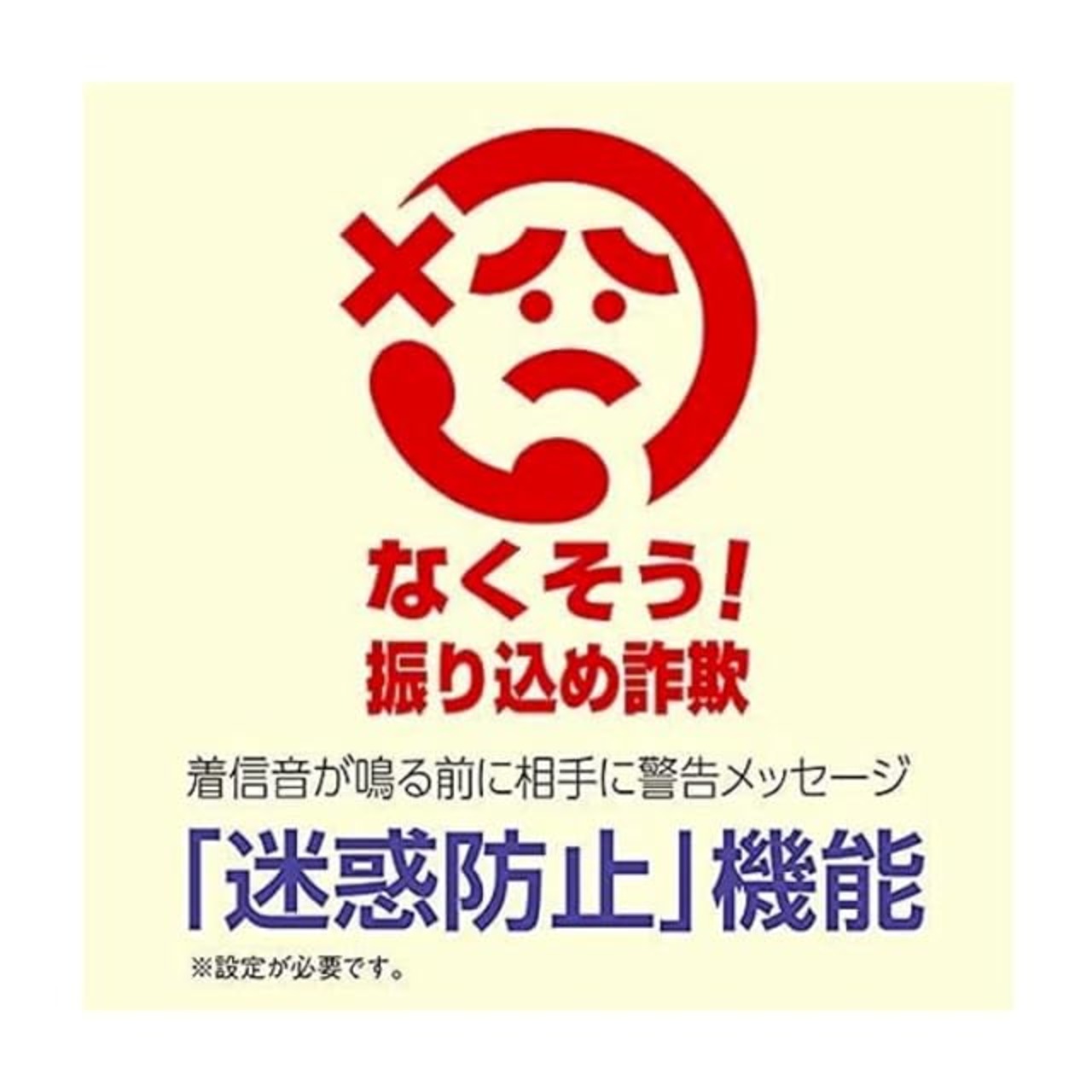 ◆商品紹介<br> 特殊詐欺や迷惑電話の対策に「迷惑防止※1」機能を搭載<br> ・視認性の高いホワイト液晶&見やすくなったダイヤルキー<br> 親認性の高いホワイト液晶を採用。<br> ダイヤルキーの文字の太さを従来機種より約20%太くし見やすくなりました。<br> 「迷惑防止」ボタンも文字色を反転し見やすくなりました。<br> <br> ・呼出音が鳴る前に相手に警告メッセージを流す「迷惑防止」機能搭載<br> 呼出音が鳴る前に相手に自動で警告メッセージ。<br> 着信中は呼出音と注意喚起のアナウンスを交互に繰り返します。<br> 電話に出ると通話を1件(最大約10分)録音。<br> <br> ・ナンバー・ディスプレイ契約なしでも不在着信履歴を表示(日付・時刻のみ)<br> ナンバー・ディスプレイを利用していない場合でも着信履歴を残せます。<br> 出なかった電話の日付と時刻を30件まで 記憶(電話番号は非表示)。<br> <br>