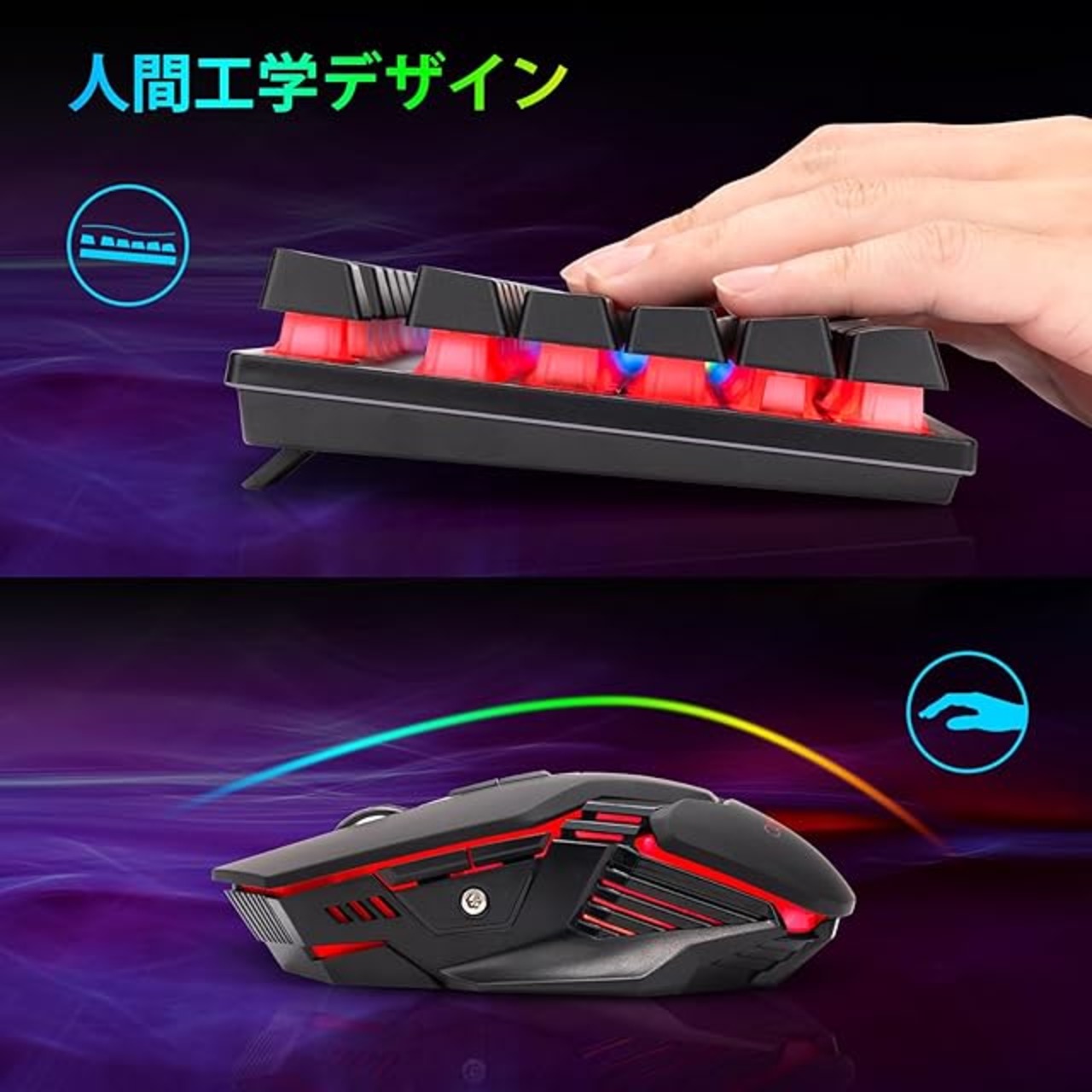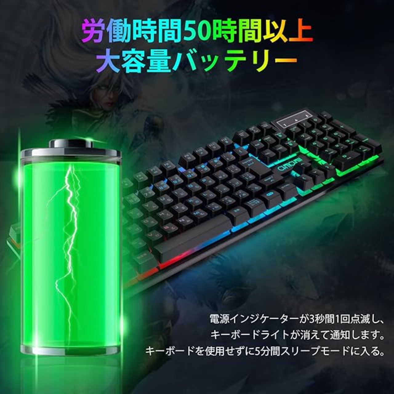 【充電式キーボードマウスセット】ワイヤレスゲームキーボードマウスセットには大容量充電式バッテリーが内蔵されています。キーボードは2500mAh容量のバッテリー、マウスは500mAh容量のバッテリーだ。バッテリ寿命が長くなり、バッテリ交換が不要になります。長時間操作しないと自動的にスリープモードになります。スリープモードに入って、バッテリー寿命と使用時間を延長できます。