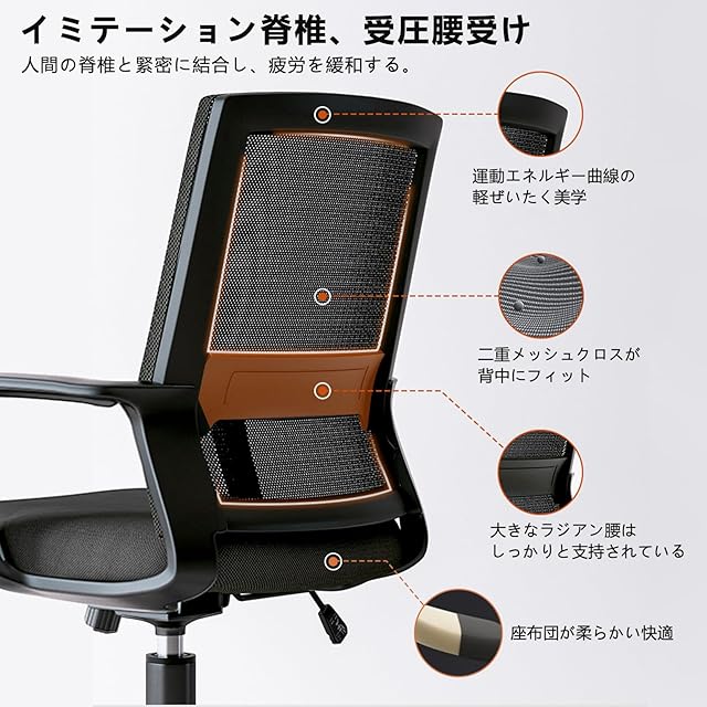 【人間工学】人間工学の概念に基づき、椅子はS型背もたれ設計を採用し、人体の曲線に一致する設計と同時に、全体の力点を有する。 アーチ型補強アームレストで腕にフィットするので、長時間の作業でも疲れにくくなっています。 【通気性抜群のメッシュ生地】背もたれと座面には、通気性の良いメッシュ素材を採用しました。メッシュは背中にやさしく、長時間の作業もサポートします。通気性の良い座面は、座り心地を良くし、一日中腰のストレスを感じさせません。 【実用性満点の多機能】 ◎約25度ロッキング機能 ◎8cm昇降機能 ◎スムーズに移動できる静音キャスター ◎360度回転座面