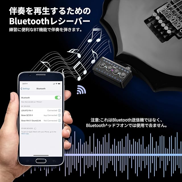 【バックグラウンドミュージックを再生するBluetoothレシーバー】音楽信号をギターヘッドホンまたはスピーカーに転送するBluetoothレシーバー機能を備えたLEKATOポケットギターアンプ(Bluetoothヘッドホンとは互換性がなく、有線ヘッドホンが必要です)。